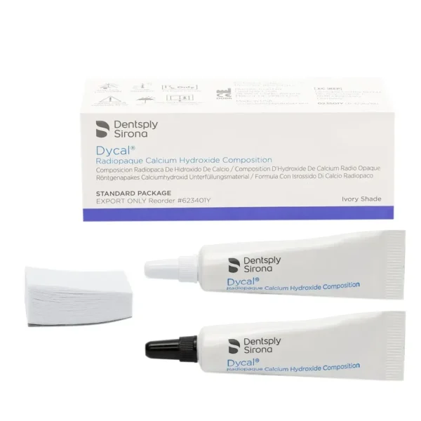 Dentsply Dycal is a rigid, self-setting material useful in pulp-capping(direct and indirect pulp capping), and as a protective base/liner under dental filling materials. It will not inhibit the polymerization of acrylic and composite restorations. Based on the original Dycal formulation, Dycal Radiopaque Calcium Hydroxide Composition provides the potential for improved esthetics, as well as clinically proven performance. Dycal offers improved physical properties with higher compressive strength and lower solubility than the original Dycal product that serves as the standard in calcium hydroxide materials. The quick set time and excellent handling characteristics of Dycal have helped make it the #1 selling calcium hydroxide composition. Dycal stimulates the formation of secondary dentin.