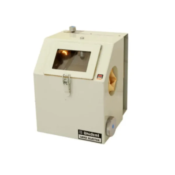 Unident Dental Sand Blaster measures 10 x 13 x 14 inches with rubber glove for abrasion free working on casting with high quality nozzle for contamination free smooth finish of articles built in light and exhaust filter for pollution free atmosphere, large glass for easy viewing.